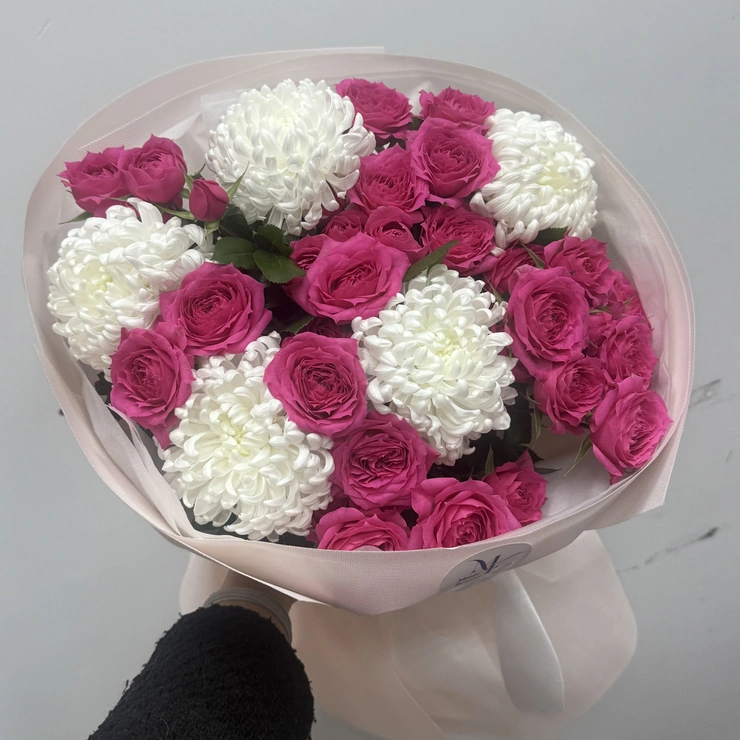 Элегантный букет из ярко-розовых кустовых роз и белоснежных хризантем гармония нежности и выразительных эмоций.